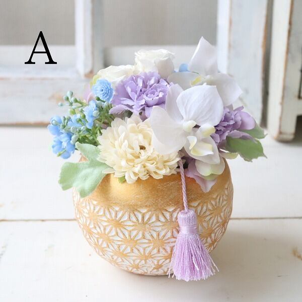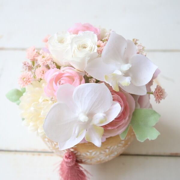 A:バラ(プリザーブドフラワー)胡蝶蘭 マム カーネーション 紫陽花 グリーン(アーティフィシャルフラワー) タッセル など