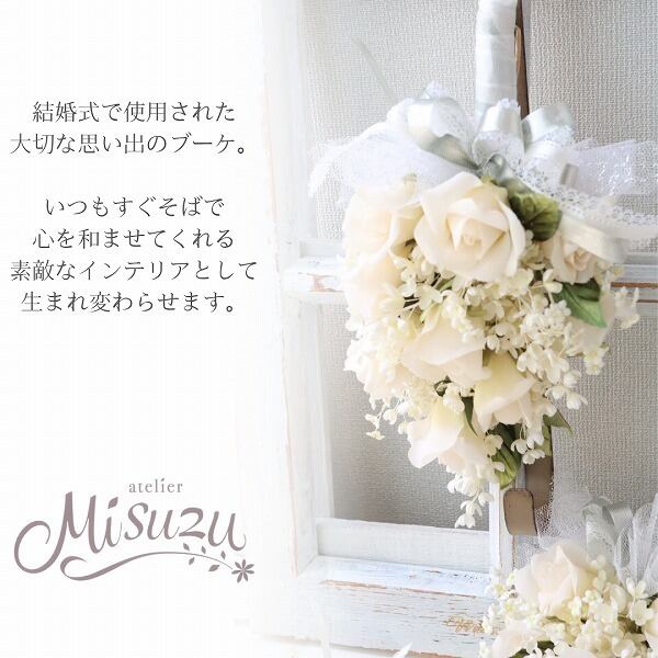 結婚式や前撮りで使用したアーティフィシャルフラワーやプリザーブドフラワーのブーケを、玄関やリビングにも飾りやすいスワッグにリメイク。