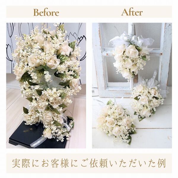 ◆こちらのサービスは、アーティフィシャルフラワーまたはプリザーブドフラワーを対象としたリメイクサービスとなっております。ドライフラワー・生花は性質上リメイクに適しませんのでお預出来かねますますのでご了承くださいませ。