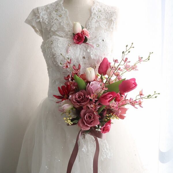アーティフィシャルフラワー(造花)を使用しているため、前撮りや海外ウェディング、二次会にも安心して持ち運びいただけます。