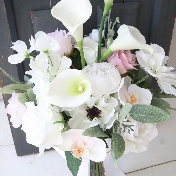 アーティフィシャルフラワー(造花)を使用しているため、前撮りや海外ウェディング、二次会にも安心して持ち運びいただけます。お式の後も、思い出のブーケとしてお部屋に飾ってお楽しみください。