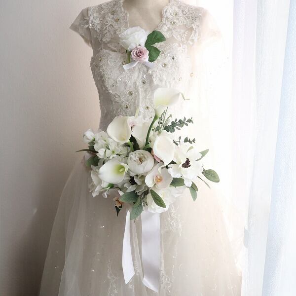 純白のウェディングドレスに美しく映える、ホワイトとグリーンを基調としたブーケです。