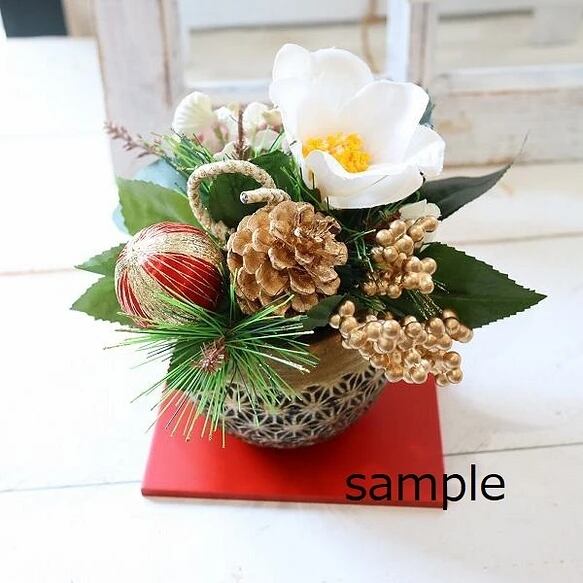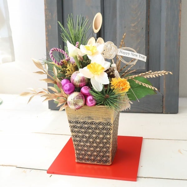 ゴールドに輝く葉や、鮮やかなマゼンタ色の毬が、おめでたい雰囲気を一層高めます。