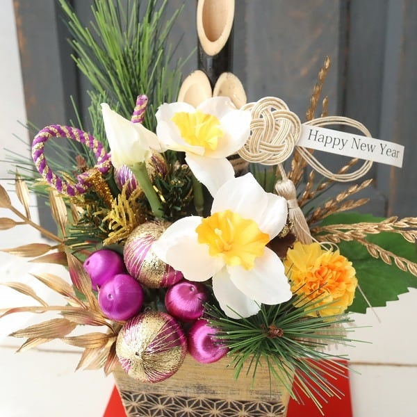 縁起の良い松や竹をあしらい、清らかな水仙をメインに、お正月らしさを上品に表現しました。