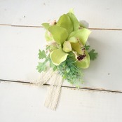 シンビジュームの凛とした美しさを主役に、春の訪れを感じさせるような明るいグリーンのグラデーションで仕上げたコサージュです。