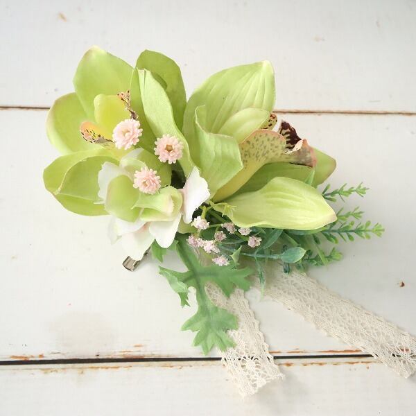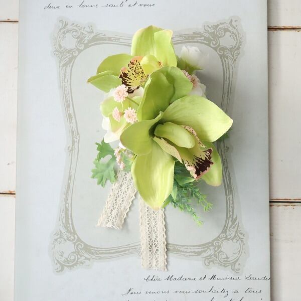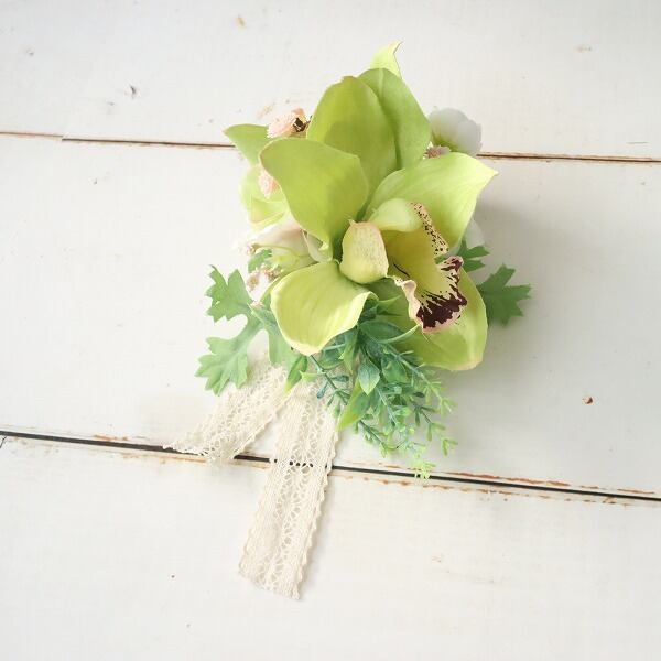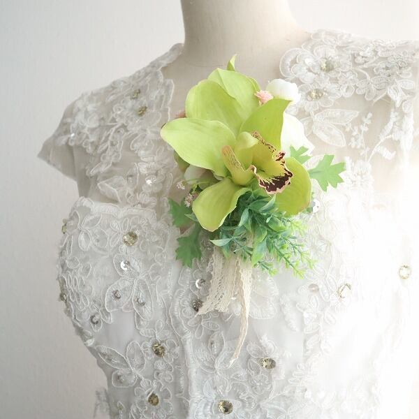 シンビジュームの気品あふれるコサージュ 春色グリーンのグラデーション 卒業式 入学式 結婚式 セレモニー 337