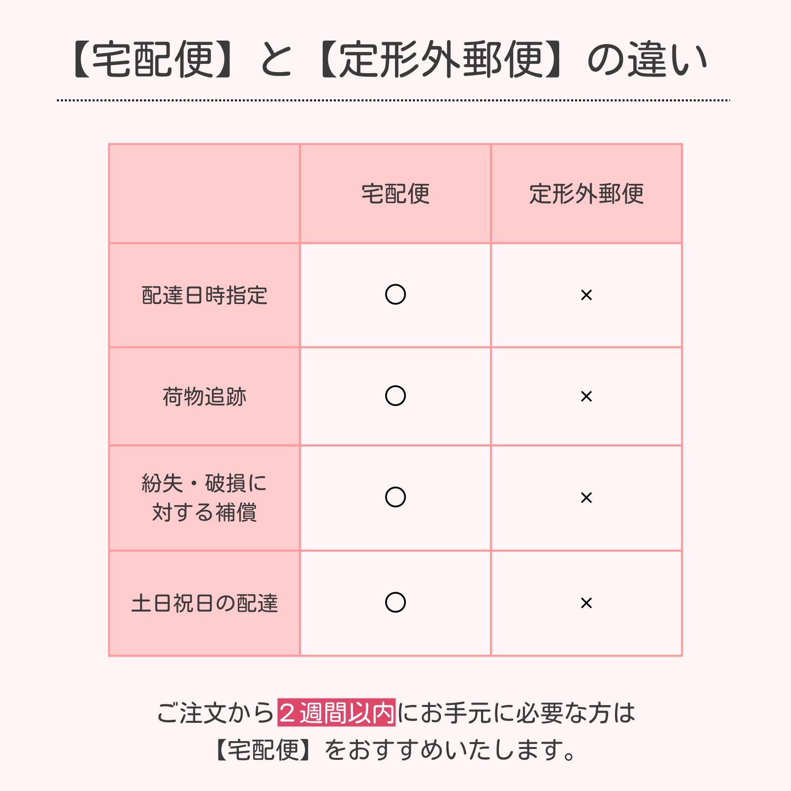 追跡不可・補償無しの配送方法のため、お急ぎの方や日時指定希望の方は宅配便を推奨いたします。