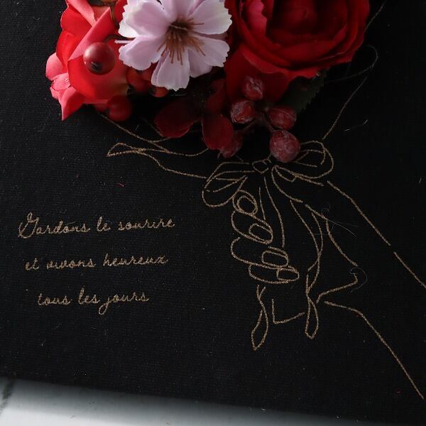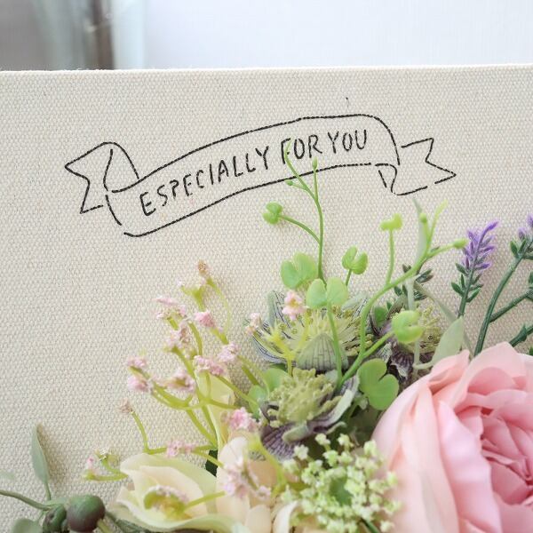 高品質な造花(アーティフィシャルフラワー)を一つ一つ丁寧にアレンジし、キャンバスに描かれた繊細なブーケのスケッチとメッセージに重ね合わせました。