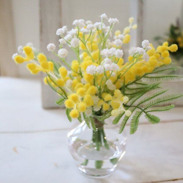 春色のポップなイエローミモザ&カスミソウのウォーターアレンジです。