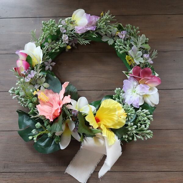 プルメリアやハイビスカスを使用した南国感溢れるアレンジリースです。