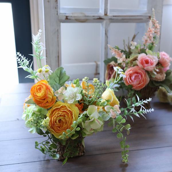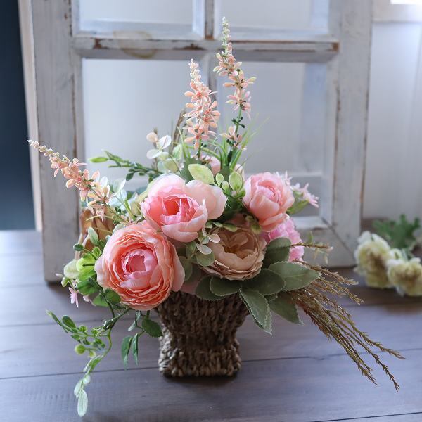 ナチュラルな籐のバスケットにふんわり活けたフラワーアレンジメントです。