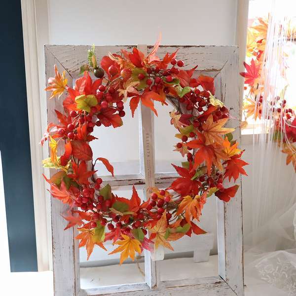 紅葉した実と葉が、季節の移ろいをしっとりと感じさせてくれる紅葉と山帰来(サンキライ)のリースです。