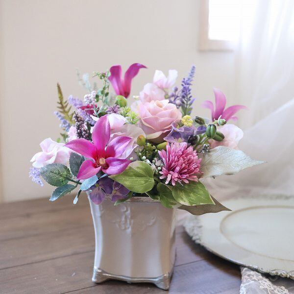 水やり不要、枯れずにお気軽に飾れる造花フラワーアレンジメントが人気です。