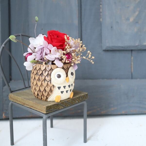 その愛らしさと縁起の良さで人気のふくろうのアレンジメント。