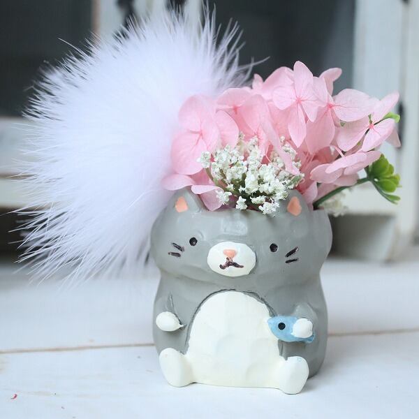 グレー、ブラック、イエローのねこちゃんたちは、それぞれ異なる色の花で飾られており、柔らかなファーがアクセントになっています。