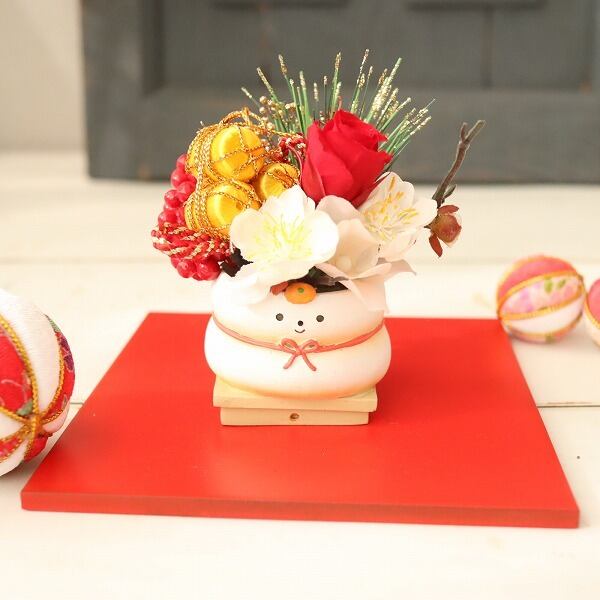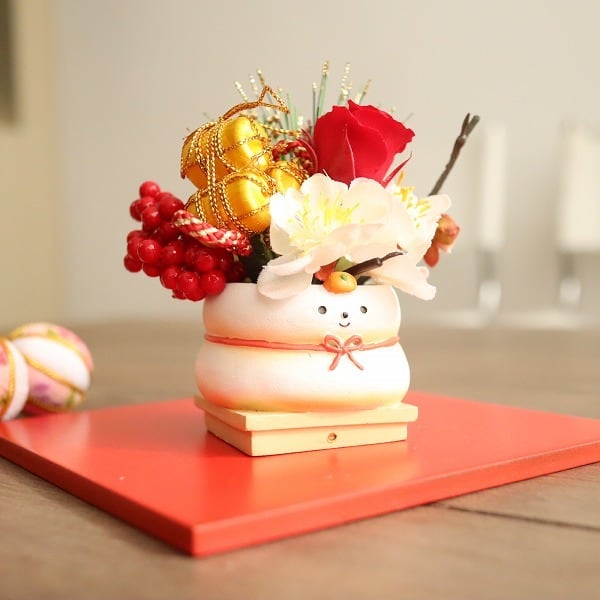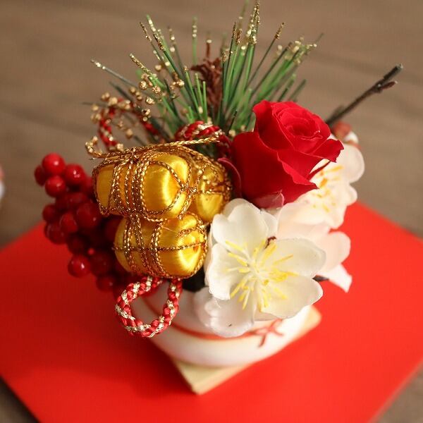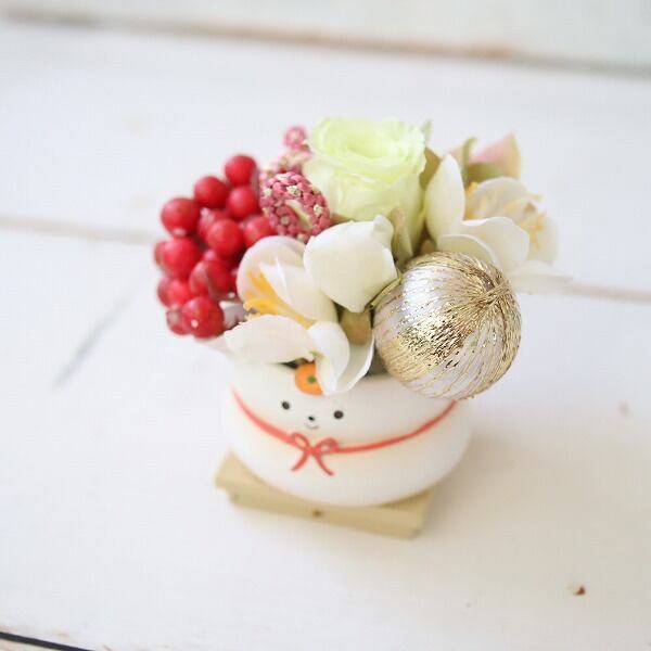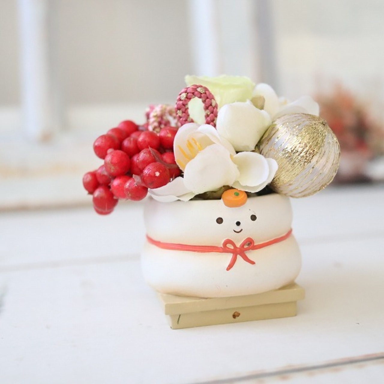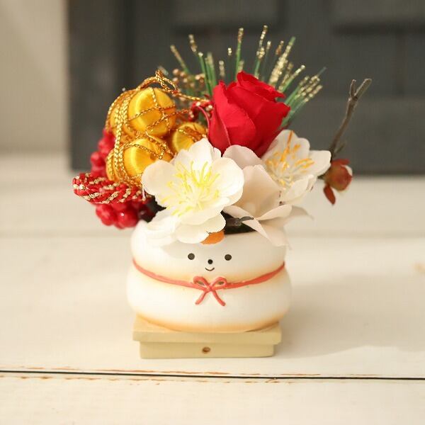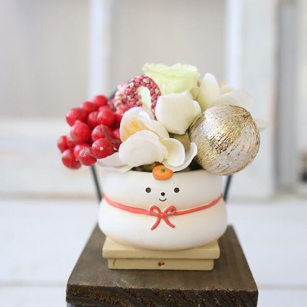 鏡餅の頭に咲いたお花がなんとも可愛らしいお正月にぴったりのミニアレンジメントです。